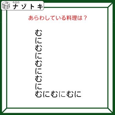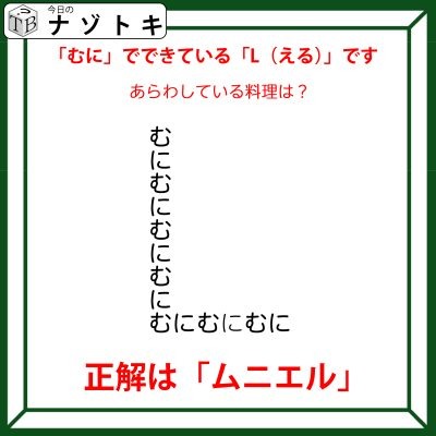 つまり「むに」で「L(エル)」ができていることになります。ここまでいけばもうわかりますね。そうです!「ムニエル」です。というわけで正解は「ムニエル」でした。