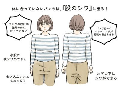 パンツは、「股ぐり(はいた時の股のカーブ具合)」の縫い合わせや、「小股(股のつけ根部分)」のシルエットが体型に合っていないと、股が食い込んで見えたり、お尻の下に余った布のシワが寄ってしまって美しく見えません。このような過分なシワや食い込みが生まれる原因は、股ぐりの縫製が粗雑な既製品である可能性が高い他に、ご自身の姿勢グセや、体型によって生まれてしまうことが考えられます。