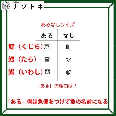魚偏に「弱」がつくとイワシを表す漢字となりますね。残りの漢字にも目を向けてみるとそれぞれ魚偏がつくとクジラ、タラとなります。正解は「ある」側は魚偏がつくと魚の名前になる。でした。