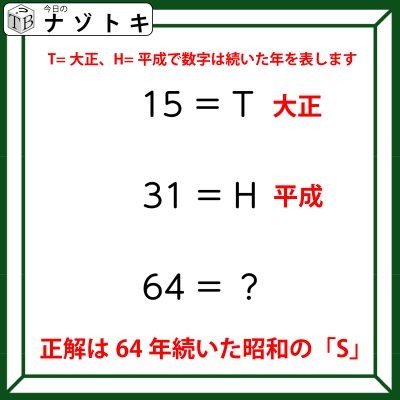 64年続いた和暦、そうです!平成の一つ前の昭和です!ここでピンと来たという人も多いのではないでしょうか。というわけで正解は昭和の頭文字である「S」でした。