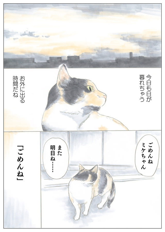 おばあさんは残念ながら亡くなられて、今はお家の2階ではなく空の上からミケちゃんを見守ってくださっています。