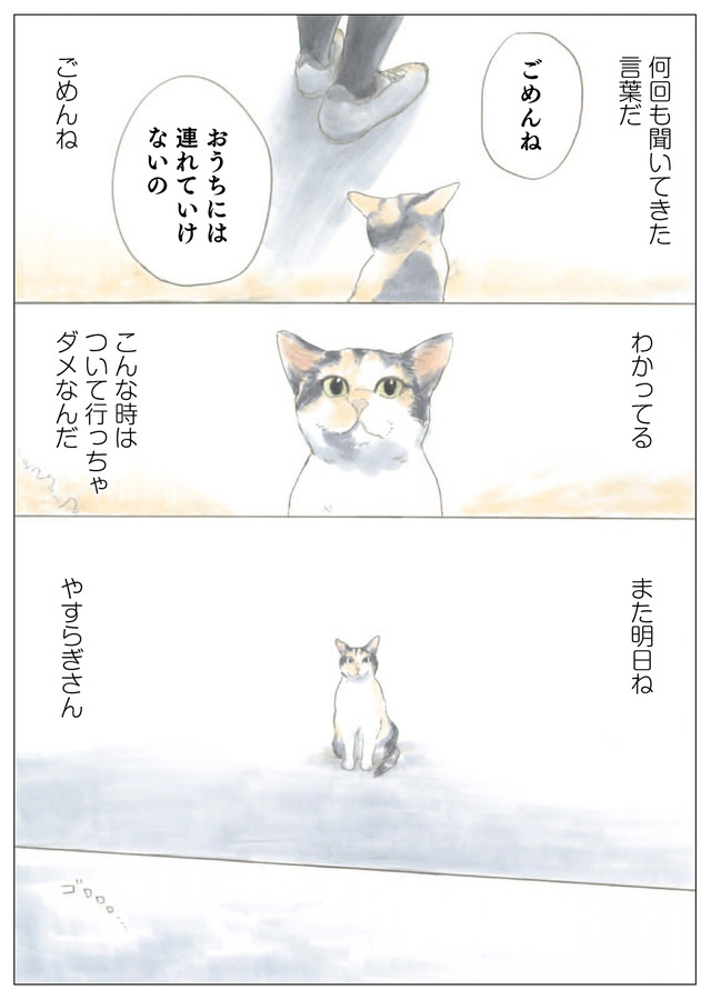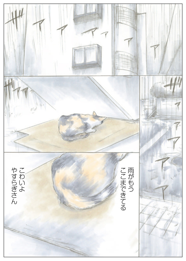 雨宿りしてたミケちゃんと目が合った時、ミケちゃんはホッとしたようにニコッと笑ってくれたんだ。他人に話せば「気のせいだよ」と言われてしまうかもしれないけど…。