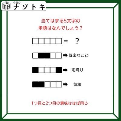 3つの単語の答えは上から「のんき」「うてん(雨天)」「てんき」です。そして正解は「のんき」とほぼ同じ答えになるそうです。