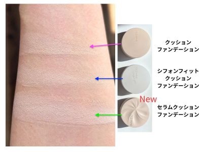 同じ「NO10 明るいオークル系」で比較してみました。最も違うと感じたのは、色。廃盤した2品は黄み寄りだったのに対し、新作は、ピンク寄りで、廃盤した2品と比較してやや白っぽい仕上がりになります。とはいえ、肌に溶け込むような仕上がりになるので、白浮きするようなことはないと感じました。