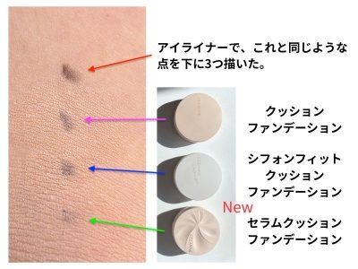 カバー力について、腕にアイライナーでホクロのような点を描いて検証してみました。廃盤2品と比べてしっかり色がのることによって最も高いカバー力を発揮しました。