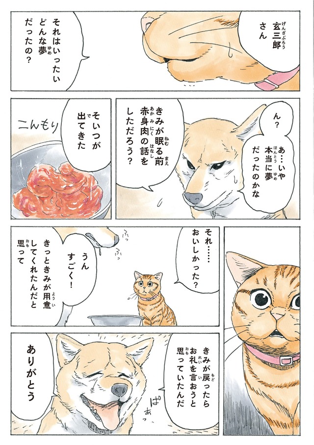 半年前ゲリラ豪雨の日に、ふらりとやってきたアカトラの猫に「マドレーヌ」と名付けたかのこちゃん。そしてマドレーヌ夫人は、老犬の柴犬・玄三郎の妻になる!?