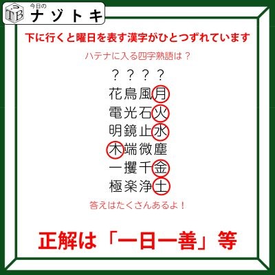それは曜日です。花鳥風「月」の次は電光石「火」、その次は明鏡止「水」です。この後は割愛しますが曜日が並んでいます。そしてさらにその曜日も順番通りに並んでいるようですね。