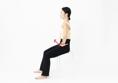 足を肩幅に開き、椅子に浅く座る。背筋を伸ばしたまま、お尻を後ろに突き出すように骨盤を後ろに倒す。
