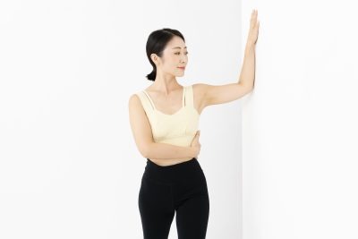 肘を直角に曲げ、壁に手をペタッとつける。反対側の手は肋骨に添える。足は前後に開きましょう。