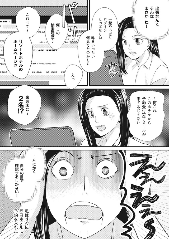 「出張」と嘘をつく夫のあとを追い、不倫旅行の現場を目撃する美奈子。