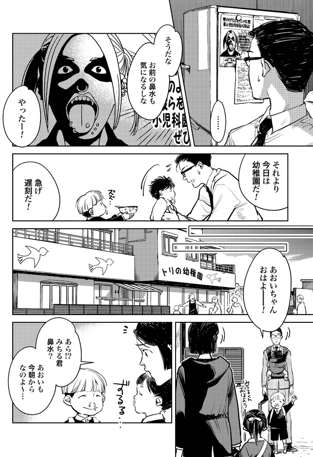 息子が嘔吐! 羽根田は困っていたところを悪魔のようなメイクを施した若手小児科医・琴吹に救われる。