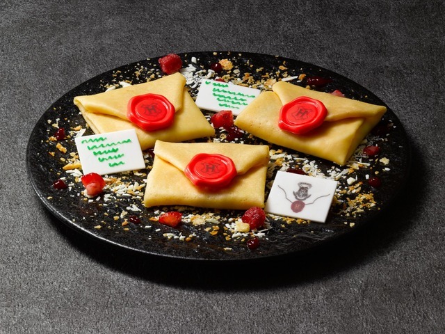 ハリーのもとに届いた大量の入学許可証を表現した「入学許可証のクレープ」は、3種のフレーバーで再現。ホグワーツ魔法魔術学校での“組分けの儀式”をテーマにした「組分け帽子チョコレートタルト」は、カットすると4寮いずれかのカラークリームが現れる。