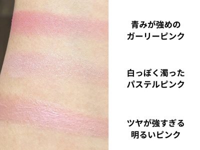 大人が注意したいのは、青みが強めのガーリーピンク、白っぽく濁ったパステルピンク、ツヤが強すぎる明るいピンクです。これらは肌のくすみや小ジワを強調しやすく、顔から浮いて見えがちです。