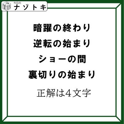 それではそのようにそれぞれ文字を拾っていきましょう。暗躍(あんやく)の終わりなので「く」、逆転(ぎゃくてん)の始まりなので「ぎ」、ショーの間なので「ョ」、そして裏切りの始まりなので「う」となります。これで拾う文字が分かりました。