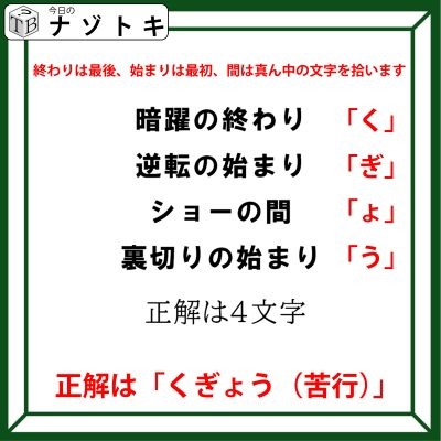 あとはその文字を順に読んでいけば答えとなります。正解は「くぎょう(苦行)」でした。
