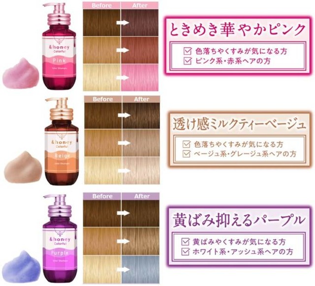 日々のヘアケアでカラーの美しさを持続させるカラーシャンプーシリーズとして誕生。カラーをプラスする染色成分に加え、ブランドの特長であるハチミツ*の保水力に着目した処方で、ダメージ補修や褪色抑制成分などカラー後の髪に必要な成分を配合する。