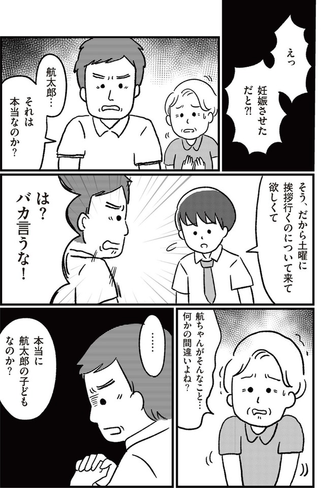 娘を妊娠させた相手は彼氏の航太郎といい、親たちの間で子どもは諦める方向に話が進むが、2人は家出をしてしまう。