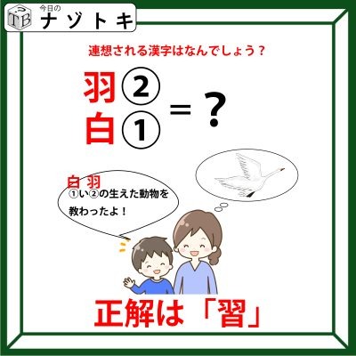 あとは答えを考えていきましょう。が縦に並んでいますので。実際に「白」と「羽」を縦に並べてみましょう。そうすると、とある漢字に見えてくると思います。そうです!「習」です。というわけで正解は「習」でした。