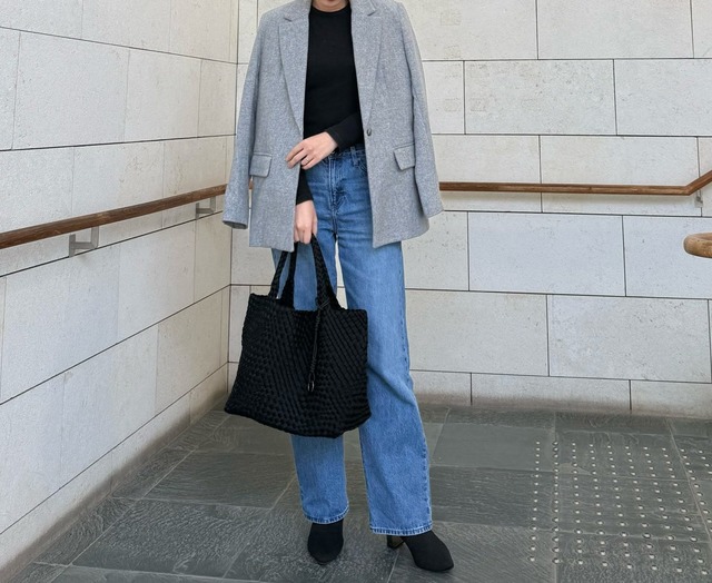 足元は黒のブーツで引き締めつつ、編み込みデザインのバッグが着こなしのアクセントになっています。全体をベーシックな色調でまとめることで、カジュアルなデニムもオフィスに馴染む落ち着いた印象に。収納力がありながら見た目にも配慮したアイテム選びが、忙しい毎日に寄り添ってくれます。