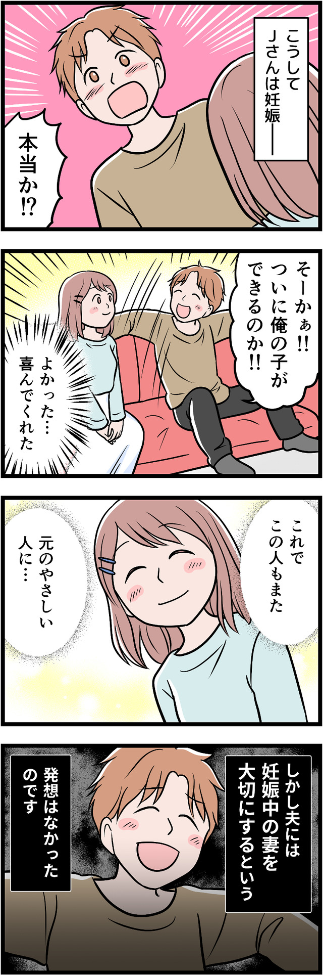 本編ではJさんの置かれた状況について説明をしました。「私が妊娠を伝えた時、夫はとても喜びました。でもそれは、『自分の分身ができる』という喜びだけだったのです」▶▶つわり中のドライブ、私の横でタバコを吸う夫。吐きそうになった私に「車を降りろ」と言ってきて では、妊娠中のJさんが夫からうけた仕打ちについてお伝えします。