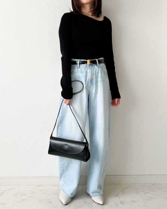黒のリブニットに淡いブルーのワイドデニムを合わせた、tomomiyu0920さんの洗練されたカジュアルスタイル。一見シンプルですが、アシンメトリーなネックラインがデコルテをきれいに見せ、着るだけで洗練された印象を与えてくれます。体にフィットしすぎない絶妙なサイズ感のニットは、ボトムスにタックインすることで腰位置が高く見え、脚長効果も抜群。