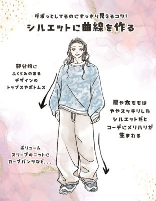本記事では、「ダボ」トップス×「ダボ」ボトムでもできるメリハリコーデの作り方をご紹介しました。つづく関連記事では、ゆったり服でデブ見えを防ぐ、もうひとつのテクニックをご紹介します。