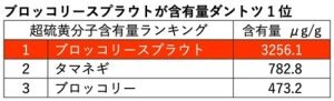 このように、ブロッコリースプラウトは、ブロッコリーの7倍、タマネギの4倍も多く超硫黄分子が含まれていることが分かりました。超硫黄分子を取り入れるなら、ブロッコリースプラウトが一番の近道と言えるのです。