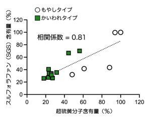 上記のグラフのとおり、ブロッコリースプラウト内のスルフォラファン含有量と超硫黄分子含有量は相関関係があり、スルフォラファンの多いブロッコリースプラウトほど、超硫黄分子も多く含有する傾向が強いことを示しています。すなわち、スーパーに並ぶブロッコリースプラウトを選ぶときは、スルフォラファン含有量の多い商品を選ぶと、超硫黄分子の効果も、より多く得られることになります。
