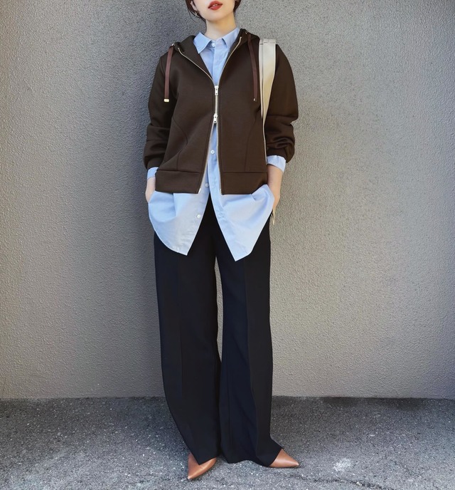 サックスブルーのシャツにブラウンのジップアップパーカーを重ねた、sakura.031358さんの奥行きあるレイヤードスタイル。パーカーは肉厚でハリのあるダンボール素材を選んでいるため、カジュアルになりすぎず品よくまとまります。コンパクトなサイズ感の羽織りからシャツの裾を大胆にのぞかせることで、腰まわりを自然にカバーしつつ、旬のリラックス感を演出。
