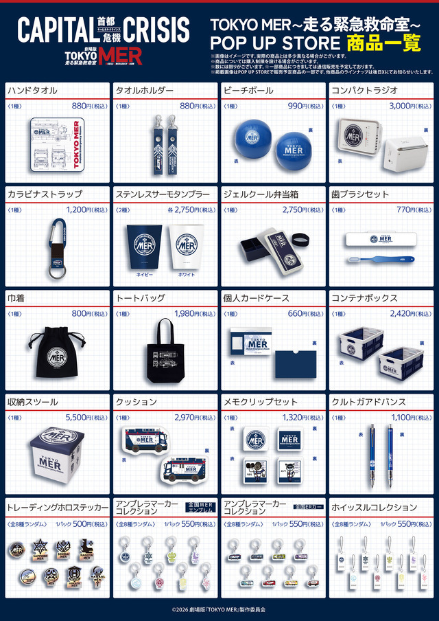 会場は、新宿マルイ アネックス、名古屋セントラルパーク、なんばマルイの3か所となっている。なお、『TOKYO MER~走る緊急救命室~』POP UP STORE公式Xによると、4月25日(土)10:40~14:30、4月26日(日)10:40~14:30はWEBチケット予約(先着制)となっており、予約開始日は4月17日(金)18:00~となっている。