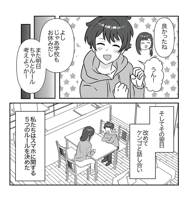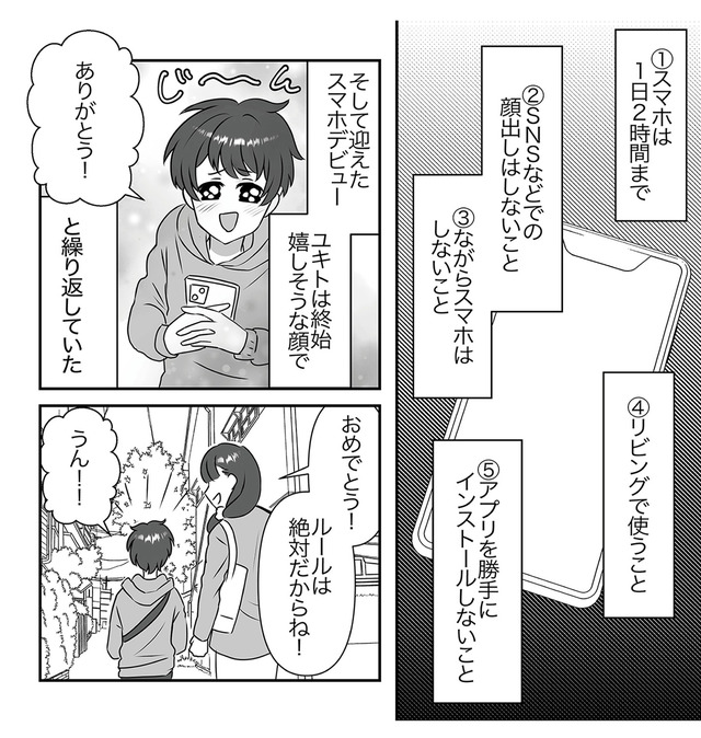 息子からスマホが欲しいとねだられて、両親は5つの決まり事を作り息子にも携帯を持たせることに。