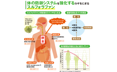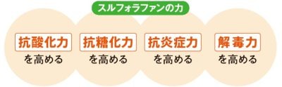 大きな特徴は、健康効果が高いと注目されるスルフォラファンがたっぷり含まれていることです。スルフォラファンは、抗酸化、抗糖化、抗炎症、解毒作用を高める効果があり、生活習慣病予防や免疫力アップ、老化予防などに役立つといわれています。そこで、「ブロッコリースプラウトのすごい健康長寿力」(主婦の友社)より、お茶の水女子大学 生活科学部 食物栄養学科 森光康次郎教授の解説を抜粋して紹介いたします。
