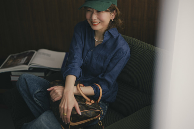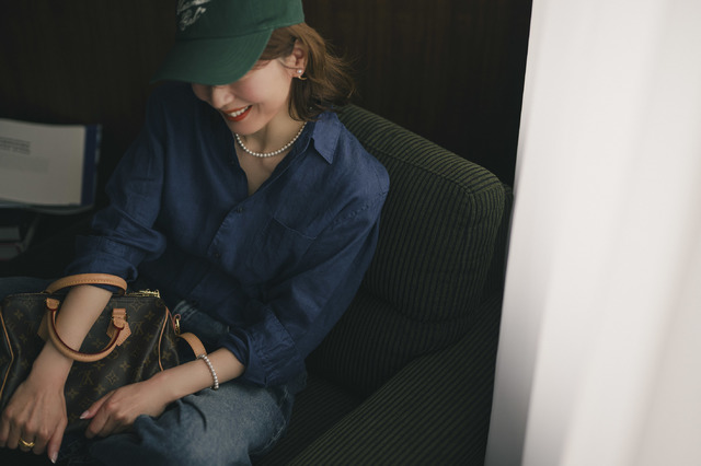 磁気の力をしっかり感じるためにもネックレスは首まわりに密着しているほうがいいかなと思い、合わせたのはVゾーンがすっきりと開いたメンズの「プレミアムリネンシャツ」。ネックレスは42cmのタイプを選びましたが、パールネックレスでもっとも使い勝手がいいとされる“40cm前後”ということもあって短すぎず、長すぎずの絶妙なバランス。やや小ぶりの6mmサイズの珠も上品で、リラックス感のあるリネンシャツも一気に女性らしく格上げしてくれます。