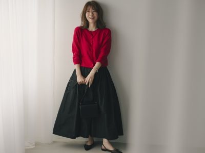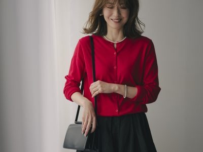 そんなパールの可愛さを生かし、次に合わせたのは「UVカットクルーネックカーディガン」。これもリネンシャツ同様、私にとっては定番のユニクロアイテムですが、今季は少し気分を変えたくてビビッドな赤をチョイス! そしてこんな鮮やかな色を品よく見せたいときにも、このパールネックレスが大活躍してくれます。前述の通り、絶妙な42cmは首の詰まったクルーネックともいいバランスで、埋もれず、目立ちすぎず、顔まわりをいっそう華やかに盛り上げてくれます。