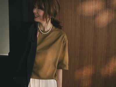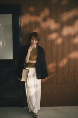 フォーマルにも使えそうな高級感があるものの、本気で肩コリ改善をめざすなら、やはり日常的に取り入れたいところ。そんな想いもあって、今回は私の普段着として欠かせない“ユニクロ”のトップスに合わせることにしてみました。
