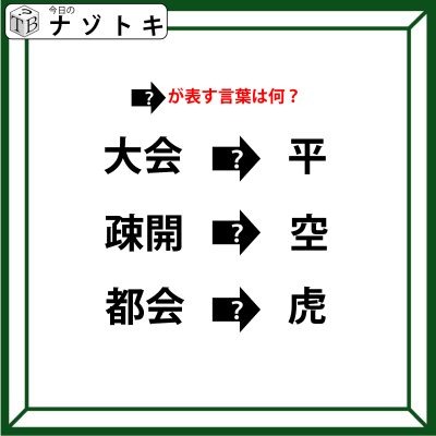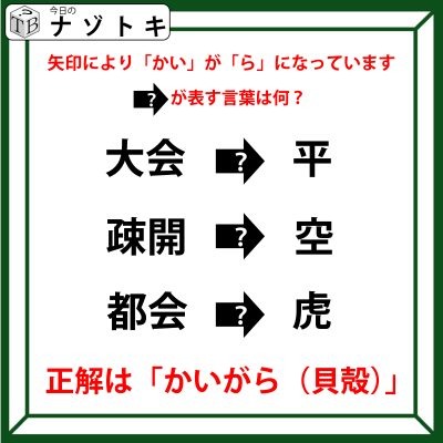 矢印そのものにハテナマークがついていますので法則そのものが答えとなります。なので、言葉の変化の法則を考えましょう。まずは、法則をわかりやすくするために漢字の状態からひらがなに直しましょう。すると、「たいかい」が「たいら」、「そかい」が「そら」に変わっています。つまり、「かい」という言葉が「ら」となっているということになりますね。ここまでくればピンと来た人もいるのではないでしょうか。そうです。「かい」が「ら」に変わっている・・つまり「かいがら(貝殻)」です!よって正解は「かいがら(貝殻)」でした。