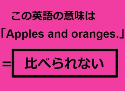 リンゴとオレンジでは、違いすぎて「比べられないよ」「比較にならないよ」「全然違うよ」というイディオム(慣用句)です。根本的に違うから比較には適さないという意味です。
