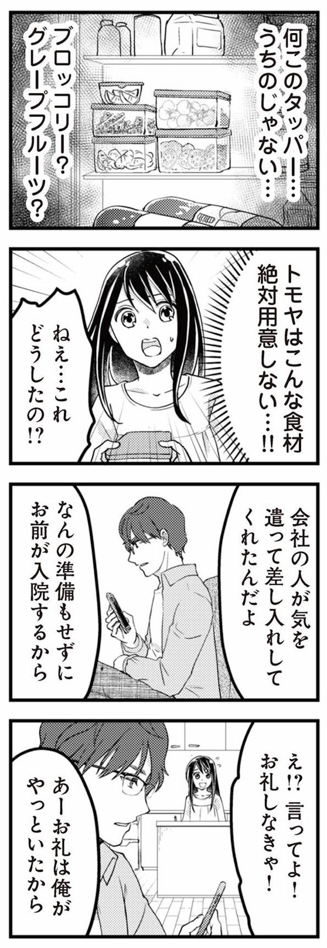 やがて体調が安定し、退院前日にトモヤから「明日迎えに行く」と連絡が入るが、当日時間になっても姿を見せない。